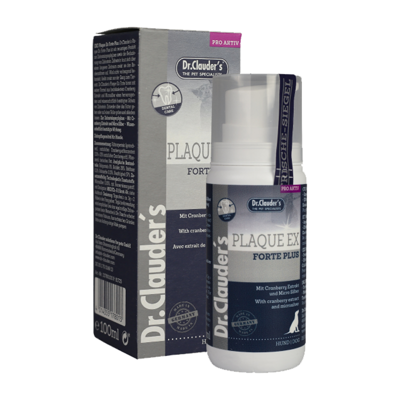 El Plaque Ex Forte Plus de Dr. Clauders, es un producto que evita la formación de placa y reduce el sarro. La placa se acumula durante un perÃodo de tiempo largo, generalmente en los molares. Esto significa un viaje al veterinario si no se trata preventivamente.