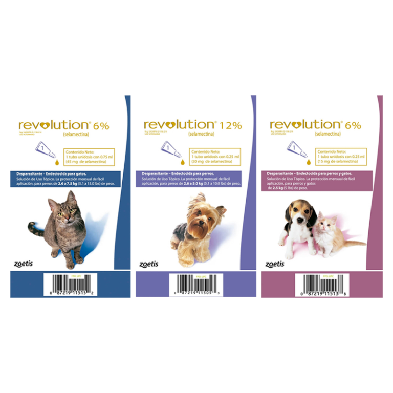 Revolution® se aplica tópicamente a la piel a la dosis mÃnima recomendada de 6 mg de Selamectina por Kg de peso corporal, una vez al mes. Se recomienda para usar en perros y gatos de 6 semanas de edad y mayores.